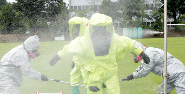 환경부 주최로 화학테러 및 사고 대응능력 평가대회가 12일 휴비스 전주공장에서 열린 가운데 참가팀들이 화학물질에 대한 개인 인체 제독을 하고 있다.