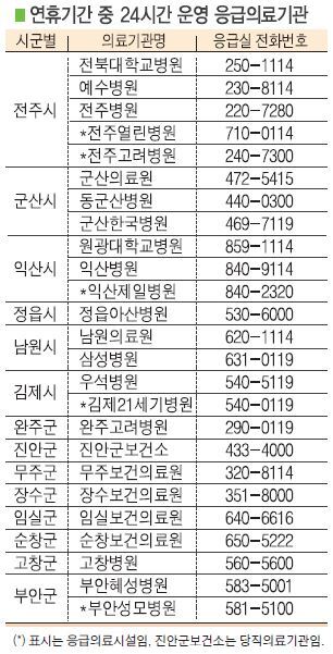 전북도에 따르면 전북대병원, 군산의료원, 원광대병원, 정읍아산병원, 남원의료원, 우석병원, 완주고려병원 등 25곳은 24시간 응급실을 운영해 긴급환자 발생에 대비한다. 1821개소 의료기관이 일자별로 진료를 벌인다.