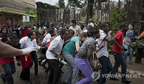 ▲ 무장괴한들이 난입해 총기난사 인질극을 벌이고 있는 케냐 수도 나이로비의 웨스트게이트 쇼핑몰 에서 21일(현지시간) 쇼핑객들이 무장군경과 괴한들의 대치 상황을 틈 타 황급히 밖으로 피신하고 있다.  AP=연합뉴스
