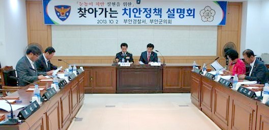 부안경찰서장(서장 남기재)은 10월 2일(수) 부안군의회 의원 회의실에서 군의원들을 상대로 부안경찰이 추진하고 있는 주요 치안정책을 설명하는 '치안설명회'를 개최했다.