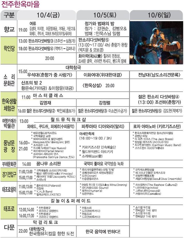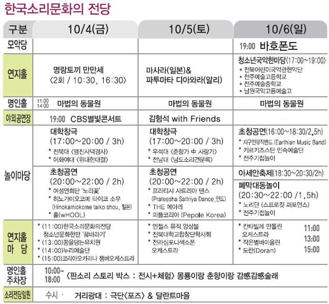소리축제는 오는 6일까지 한국소리문화의전당과 한옥마을 일대에서 판소리를 중심으로 월드뮤직, 퓨전 국악 등의 공연이 펼쳐진다.
