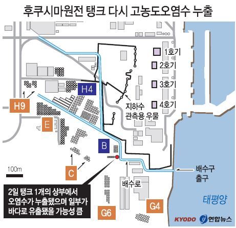 도쿄전력은 2일 후쿠시마 제1 원전의 'B남(南)' 저장탱크군에 있는 탱크 1개의 상부에서 오염수가 누출됐으며 일부가 바다로 유출됐을 가능성이 크다고 발표했다. ·연합뉴스