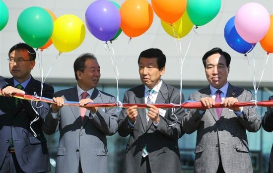 ▲ 지난 4일 완주군 봉동읍 율소리에 위치한 전북현대축구단 클럽하우스 오픈식에서 임정엽 완주군수(왼쪽부터)와 최강희 감독, 최진호 도의회 의장이 커팅식 준비를 하고 있다.
