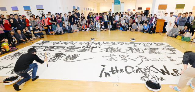 5일 한국소리문화의 전당에서 열린 세계서예전북비엔날레 개막행사에서 젊은 대학생 작가들이'동아시아의 서예 세계의 중심에 서다'란 대형 서예 퍼포먼스를 벌이고 있다.