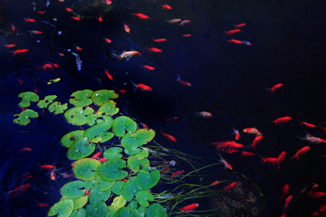 김제 이서 물고기마을의 형형색색의 금붕어 가족들이 가을 선선한 그늘 아래에서 한가로이 놀고 있다. 금붕어들이 마을을 찾은 유치원생들을 반갑게 맞이하는 듯 부산하게 움직인다.