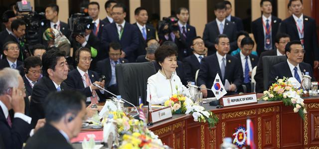 박근혜 대통령이 10일 오전 브루나이 인터내셔널 컨벤션센터에서 아세안+3 정상회의에서 박 대통령이 아베 신조 일본 총리(왼쪽) , 리커창 중국 총리와 함께 하사날 볼키아 브루나이 국왕의 인사말을 듣고 있다. 연합뉴스
