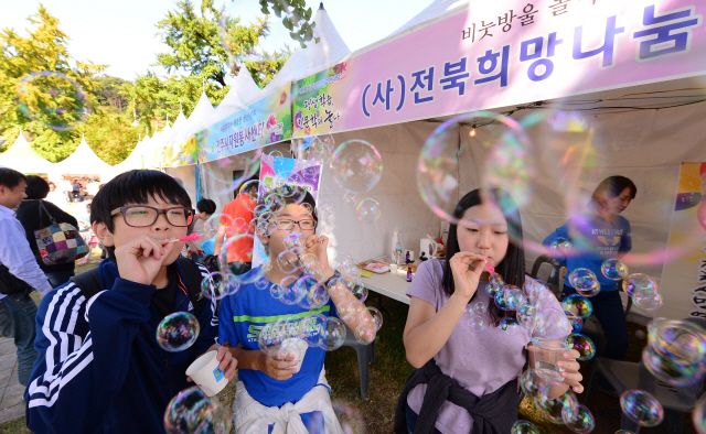 제8회 전주평생학습한마당이 13일 전통문화연수원과 향교 등 전주 한옥마을 일원에서 열렸다. 참여 학생들이 전북희망나눔재단의 비눗방울놀이 체험을 하고 있다.