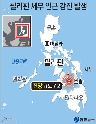 미국지질조사국(USGS)에 따르면 지진은 이날 오전 8시12분께 세부 남쪽 보홀섬의 발리리한 지역에서 동쪽으로 5㎞ 떨어진 곳에서 발생했다.