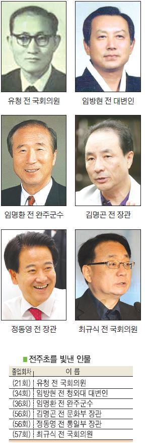네 번이나 국회의원을 지낸 유 청(21회)은 기념문집을 통해 당시 반 학생 32명 중 31명이 전주보통(북중) 전원 합격했을 만큼 전주초가 명문 예비학교였다고 소개했다. 전 청와대 대변인(34회)를 지낸 임방현, 전 완주군수를 했던 임명환(36회)도 넓은 운동장에서 찰밤 도시락 잔치로 어우러진 모교 운동회의 추억담을 전했다. 임병찬 전북애향운동본부 총재(36회)는 전주초에 다니면서 신문 배달을 하며 공납금을 힘겹게 댔던 시절의 일화를 소개했다. 56회 졸업생 중에는 이례적으로 장관이 두 명이나 배출됐다. 김명곤 전 문화부 장관과 정동영 전 통일부 장관이다. 정 전 장관은 "학생이 5000명이나 되는 전국적으로 이름난 학교였다"면서 "크고 넓은 운동장, 야외 수영장, 동물원까지 갖춘 명문 중 명문이었다"고 기억했다. '특종왕 기자' 출신이었던 최규식 전 국회의원(57회)도 전주초의 졸업생이다.