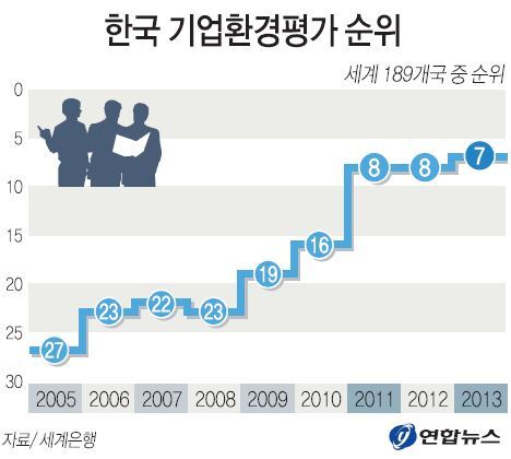 29일 기획재정부에 따르면 세계은행이 이날 발표한 기업환경평가(Doing Business)에서 한국은 평가대상 189개국 가운데 7위를 기록해 3년 연속 10위권 내에 들었다.