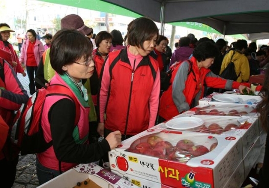 ▲ 무주 IC 만남의 광장 직거래 장터에서 무주 농특산품을 관광객들이 고르고 있다.