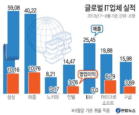 4일 IT업계에 따르면 지난 3분기(7-9월) 글로벌 IT업계의 실적을 비교한 결과 매출은 삼성전자-애플-IBM-마이크로소프트-구글 순으로, 영업이익은 애플-삼성전자-마이크로소프트(MS)-인텔-구글 순으로 집계됐다.