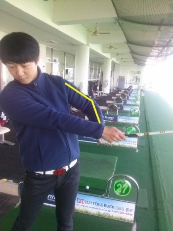 팔로우 스루에서 〈사진 2〉와 같이 왼팔을 빨리 구부리면 치킨윙이되는데, 이렇게 되면 슬라이스도 많이 나고, 회전의 축은 왼쪽인데 오른팔을 과도하게 힘을 주게 된다. 이러면 회전축이 이원화 되므로 헤드의 스피드가 당연히 줄어들 수밖에 없다.