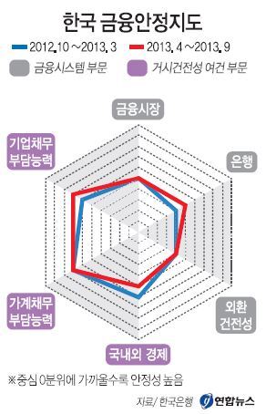 금융안정지도는 금융시장, 은행, 외환건전성 등 금융시스템 3개 부문과 국내외 경제, 가계의 채무 부담 능력, 기업의 채무 부담 능력 등 거시건전성 여건 3개 부문으로 구성, 금융 안정성 정도를 총괄적으로 보유주고자 2008년 도입한 도표다.