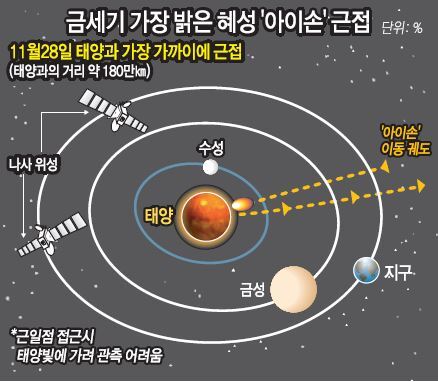국립과천과학관은 도심에서 아이손 혜성의 전체 모습을 관측하기에 좋은 날로 오는 17일을 꼽았다. 혜성의 위치가 처녀자리에서 가장 밝은 별인 '스피카'와 근접해 일반인도 쉽게 찾을 수 있기 때문이다. 연합뉴스