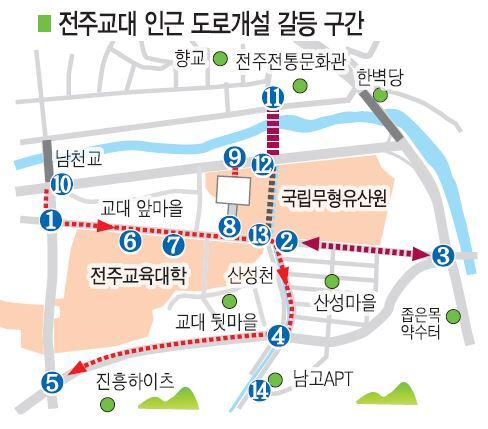 특히 주민들은 애초 전주전통문화회관에서 남고산성으로 이어지는 도로를 위해 전주천에 개설하기로 한 다리(11→12)를 짓지 않은 점에 대해서도 의구심을 제기하고 있다. 이처럼 지속하는 민원에 전주시와 문화재청은 국립무형유산원 주차장 옆에 마련된 사유지 문화시설지구를 매입, 도로로 만들것을 요구하는 등 서로 책임을 미루고 있는 상태다. '대체 도로를 이미 개설해 민원을 해결했다'던 전주시는 본지가 취재에 들어가자 뒤늦게 '주민이 사용하지 않아 볼라드를 세운 것으로 안다'고 한발 물러섰다.