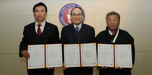▲ 남원예촌 조성사업을 위해 이환주 시장과 서거석 총장, 최기영 대목장이 협약을 체결했다.
