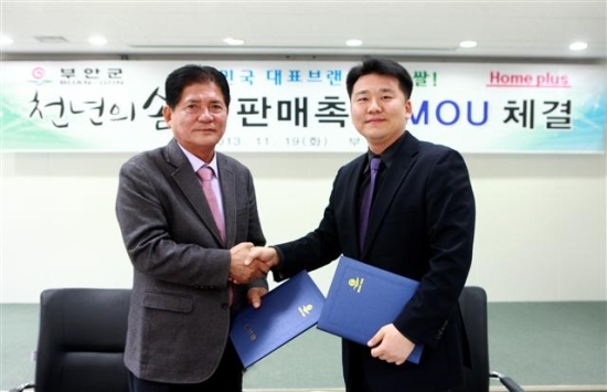 ▲ 19일 부안군청회의실에서 김호수 부안군수가 홈플러스 안태환 신선식품본부장과 ‘천년의 솜씨’판매촉진 업무협약을 체결하고 있다.