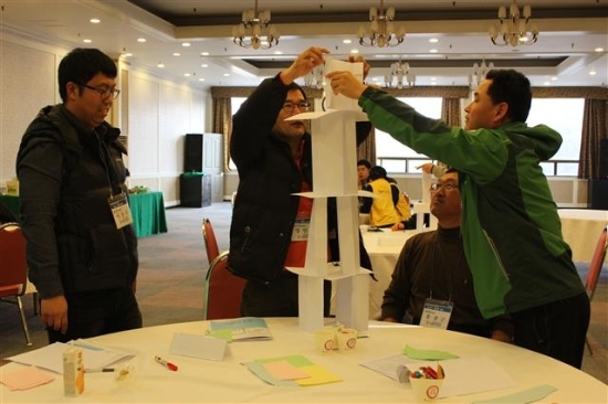 ▲ 23일부터 대둔산 호텔에서 1박 2일간 운영된 완주군다문화가족지원센터 아버지 학교 참가자들이 미션을 수행하고 있다.