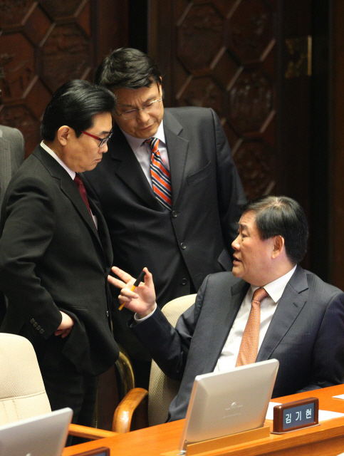 최경환 새누리당 원내대표(오른쪽)와 전병헌 민주당 원내대표가 25일 오전 국회 본회의 교육·사회·문화 분야 대정부질문에서 대화하고 있다. 이날 대정부질문은 민주당 의원들이 교학사 역사교과서의 편향성 논란을 둘러싼 정홍원 국무총리의 답변태도에 반발해 집단퇴장하면서 파행을 겪었다. 연합뉴스
