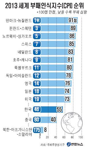 3일 국제투명성기구에 따르면 2013년 CPI 조사 결과 올해 우리나라는 100점 만점에 55점을 받았고 지난해 45위에서 올해 46위로 순위가 한 계단 떨어졌다. 경제협력개발기구(OECD) 34개 회원국 중에는 순위가 27위로 지난해와 같았다. 한국은 3년째 같은 순위를 유지했다. 연합뉴스