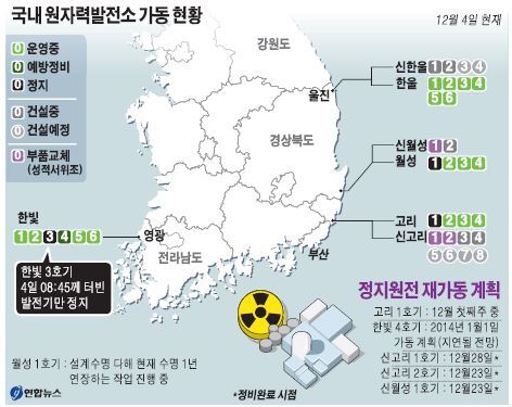 정지된 원전은 부품 시험성적서 위조 파문으로 케이블 교체 작업 중인 신고리 1·2호기와 신월성 1호기, 설계수명이 만료된 월성 1호기, 계획예방정비 중인 한빛 4호기, 지난달 28일 고장으로 정지된 고리 1호기 등이다. 연합뉴스