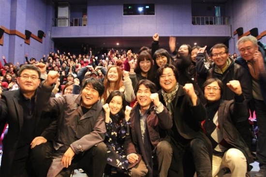 ▲ 지난 7일 전주시 고사동 전주시네마타운에서 시사회를 연 영화‘변호인’ 출연진이 관객들과 함께 사진을 찍고 있다.