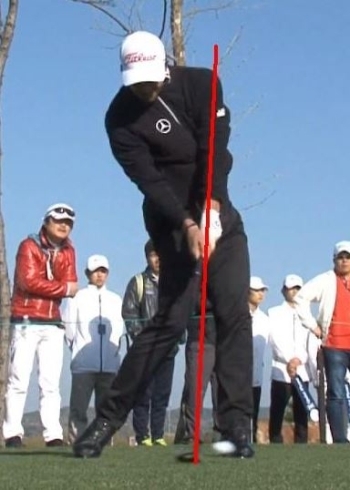 임팩트 순간에 왼팔이 사진1과 같이 구부려지는 것은 스윙의 중심이 왼손이 아닌 오른손에 있는 경우가 대부분이며, 다운스윙의 리드 또한 오른손을 사용하고 있는 것이다.