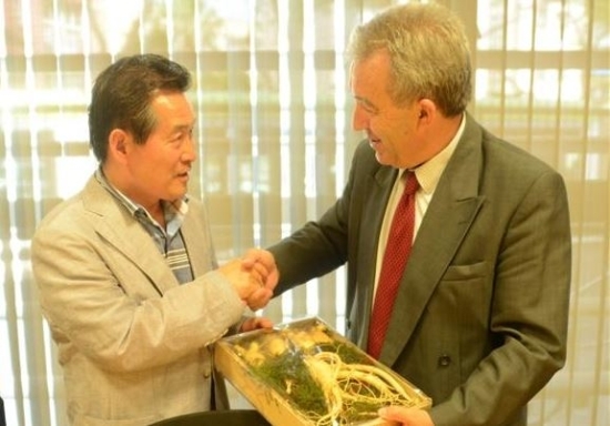 ▲ 송영선 진안군수(왼쪽)가 지난 6월 스페인 무르시아 자치주와 홍삼관련 기술협약을 맺고 있다.