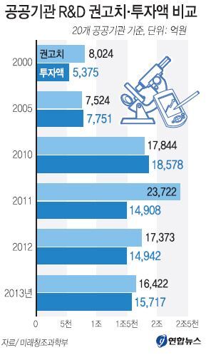 공공기관의 R&D 투자액은 2010년 1조8578억원으로 권고치를 734억원(4.1%) 웃돌았지만 2011년 1조4908억원으로 급감하며 권고치를 8814억원(37.2%) 밑돈 이후 3년 연속 권고치에 못 미쳤다.