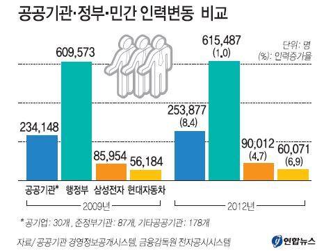 15일 공공기관 경영정보시스템(www.alio.go.kr)과 정부조직관리정보시스템(org.mospa.go.kr)에 따르면 작년 말 현재 295개 공공기관의 임직원 규모(정원 기준)는 25만3877명으로 2009년 말 23만4148명에 비해 8.4% 증가했다.