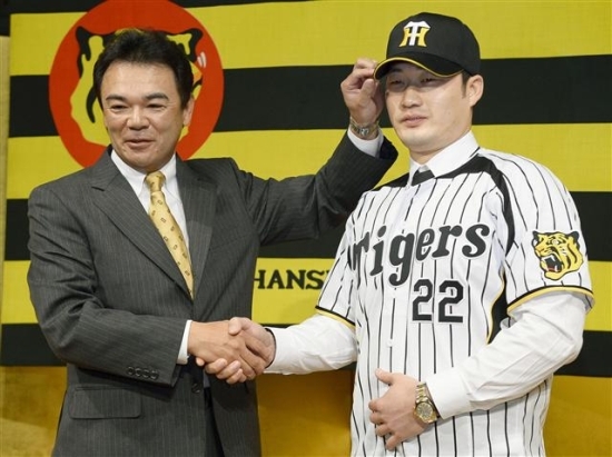 ▲ 오승환이 지난 13일 일본 오사카 리츠칼튼 호텔에서 열린 한신 타이거즈 입단식에서 와다 감독과 악수하고 있다. 연합뉴스