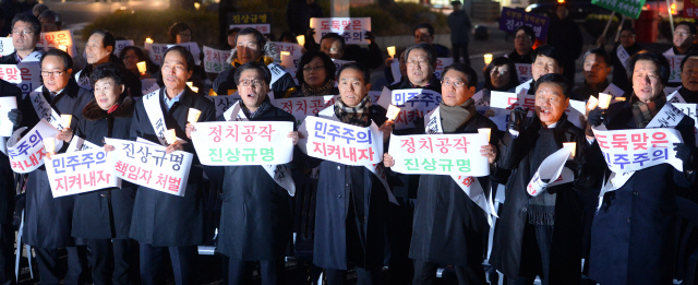 ▲ 지난 14일 전주 오거리문화광장에서 열린 전북시군의회 의원 ‘국정원 선거 개입 규탄 촛불집회’에서 이명연 전주시의장을 비롯한 참석자들이 구호를 외치고 있다. 추성수기자chss78@
