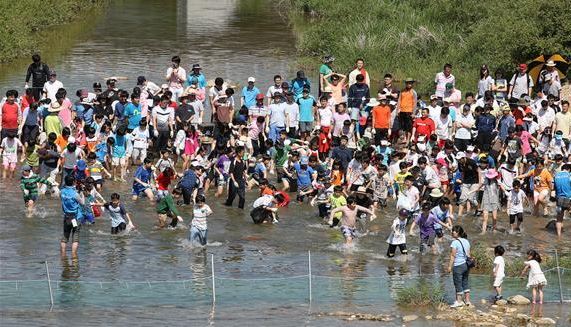 ▲ 2년 연속 정부지정 최우수 축제로 자리매김한 무주 반딧불 축제에서 참가자들이 맨손으로 송어잡기 행사를 즐기고 있다.