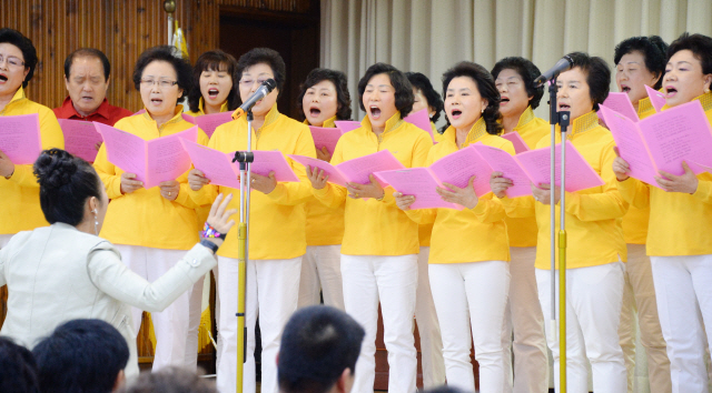 16일 전주 완산구청 강당에서 열린 완산골 한마음 노래 한마당에 삼천3동 주민자치센터 회원들이 합창을 하고 있다.