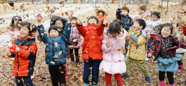 맹추위가 한풀 꺾인 17일 전주 한옥마을 향교에 나들이 나온 유치원생들이 나뭇잎을 날리며 환한 웃음을 짓고 있다.