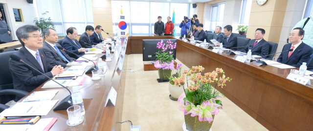 ▲ 전주지역 최초 혁신도시입주기관인 대한지적공사 정주여건 설명회가 19일 대한지적공사 회의실에서 열린 가운데 송하진 전주시장과 김영표 대한지적공사 사장이 환담을 나누고 있다. 추성수기자 chss78@