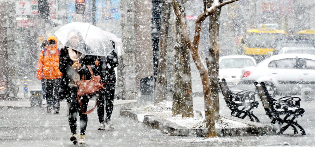 흐리고 눈이 내린 19일 전북대학교 학생들이 눈 내리는 교정을 우산을 쓴 채 종종걸음으로 걷고 있다. 기상청은 이번 추위가 일요일까지 이어질 것으로 예보했다.