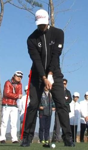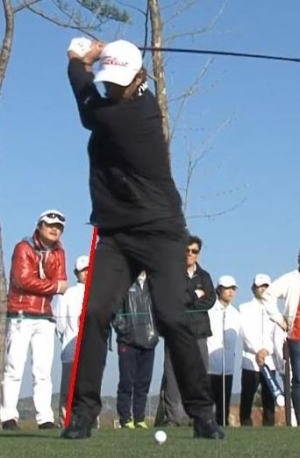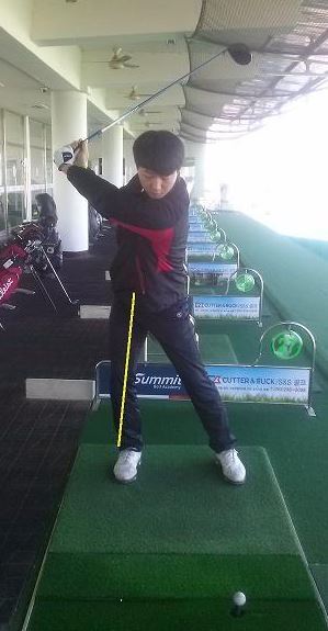 만약 사진3과 같이 백스윙 과정에서 오른쪽의 선을 자신의 무릎 혹은 고관절이 침범한다면 이는 명백한 스웨이 동작이 된다.