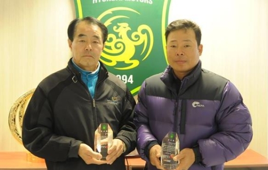 전북현대(단장 이철근)가 홈 경기의 원활한 운영을 위해 최선의 노력을 다하고 있는 시설관리공단 잔디관리 담당 신용섭(61)주임과 북전주 SNB 지원 1팀 이상현(44) 매니저에게 감사의 뜻을 감아 감사패를 전달했다.