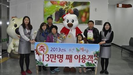 ▲ 2013년 부안 누에타운 13만명째 입장객 가족이 기념촬영을 하고 있다