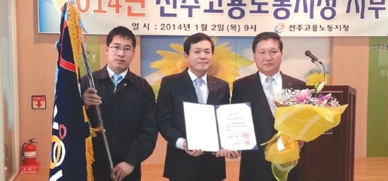 지난달 24일 열린 ‘2013년 일자리 창출 유공기관 정부 포상식’에서 국무총리 단체 표창 수상자로 선정된 (주)대유신소재 전주공장에 대한 표창 전수식이 2일 고용노동부 전주지청에서 열렸다. (주)대유신소재 전주공장은 지속적인 투자를 바탕으로 한 정기적인 공채 시행과 노동부 주관 청년인턴사업, 전라북도 청년 2000 일자리사업, 지역 채용박람회 참가 등 채용 방법 다각화를 통한 지역인재 채용 및 인재 육성에 힘쓴 공로를 인정받았다. 〈사진=전주상공회의소 제공〉