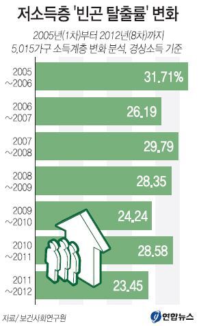 빈곤 탈출률은 특정 시점을 기준으로 이전까지 저소득층(중위소득 50%이하)이었던 가구 가운데 해당 기간 중산층(50~150%)이나 고소득층(150%초과)으로 이동한 비율을 말한다. 다시 말해 2005년에는 저소득층 가구 셋 중 하나가 2006년 살림이 나아져 중산·고소득층에 편입됐지만, 2011년 저소득층 가구의 경우 넷 중 하나 정도만 2012년 빈곤에서 벗어났다는 얘기이다. 연합뉴스