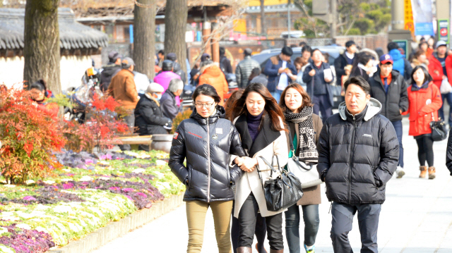 ▲ 지난해 방문객 수가 500만 명을 넘어선 전주 한옥마을의 직간접 경제효과가 3100억원에 달하는 것으로 분석된 가운데 7일 포근한 날씨 속 많은 시민들이 경기전 앞을 걷고 있다. 추성수기자 chss78@