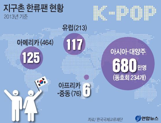 8일 한국국제교류재단이 전 세계 98개국 대사관, 총영사관 등 협조로 발간한 ‘지구촌 한류현황’(총 2권)에 따르면 지난해 지구촌 한류 팬은 아시아·대양주 지역 680만 명, 아메리카 지역 125만 명, 유럽 지역 117만 명, 아프리카·중동지역 6만 명 등 총 928만여 명에 달했다.