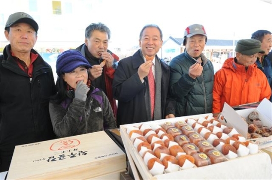 ▲ 9일 완주 고산시장‘곶감 상설판매장’개장식에서 임정엽 군수가 곶감을 맛보고 있다.