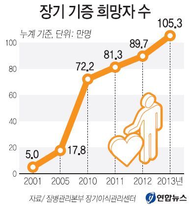 장기 기증 희망자 수는 2004년 10만 명을 넘어서고서 꾸준히 증가해왔다. 특히 2009년 김수환 추기경이 선종 후에 각막을 기증한 사실이 알려지면서 그 해에만 18만5000명 가량이 새로 장기 기증을 약속하기도 했다. 연합뉴스