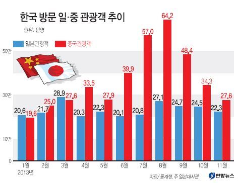 15일 통계청과 주(駐) 일본 한국대사관 등에 따르면 지난해 들어 11월까지 한국을 방문한 일본인 관광객 수는 253만2000명으로 2012년 같은 기간의 329만1000명보다 23.1% 감소했다.