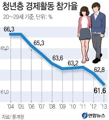 20~29세 청년층의 경제활동 참가율은 10년전인 2004년 66.3%로 정점을 찍은 뒤 줄곧 하락해 작년 61.6%까지 하락했다. 2004년에는 707만명 가운데 469만명이 직업 전선에 뛰어들었지만 2013년에는 628만5000명중 387만4000명이 일을 하고 있다. 9년만에 82만명이 감소해 매년 10만명 가량이 줄어든 것으로 계산됐다.