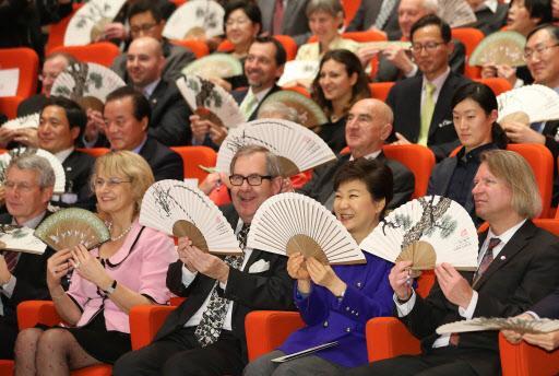 스위스를 국빈 방문중인 박근혜 대통령이 19일(현지시간) 오후 파울 클레센터에서 한국 전통예술 문화를 소개하는 코리아 판타지 공연을 관람한 뒤 피터 피셔 파울 클레센터장(오른쪽), 카우즈만 스위스 한국 의원친선협회 부회장(왼쪽 둘째) 등과 부채춤을 배우고 있다. 연합뉴스